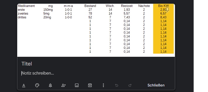 In der rechts angeordneten, farblich hervorgehobenen Spalte ist sofort ersichtlich, ab welcher Kalenderwoche eine neue Packung benötigt wird. Das ist die Kalenderwoche, in der man ein neues Rezept holen sollte. So erkennt man frühzeitig, wann ein Rezept oder Nachschub erforderlich ist.
